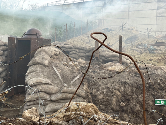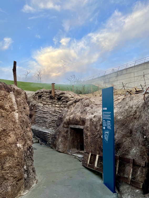 Reconstitution réaliste à l’échelle 1 d’un système-tranchée par le biais de décors en résine et d’ambiances sonores immersives. Des panneaux signalétiques, des longues-vues et des periscopes, viendront compléter l’offre de médiation.