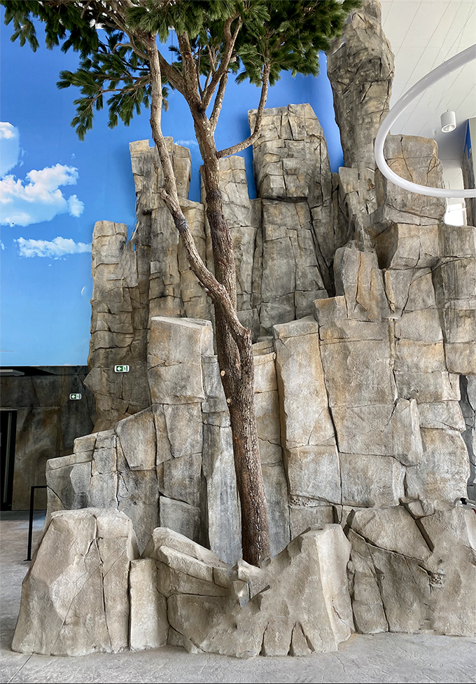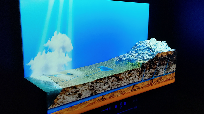 Parcours immersif sur 3 500 m² au fil du cycle de l’eau pour découvrir une dizaine d’univers et biotopes reconstitués depuis les pentes du Mont Canigou aux récifs coralliens en passant par la Préhistoire et l’aquarium géant des requins. Projections sur brouillard d’eau (fogscreen), mapping sur maquette, multiprojections immersives, effets scéniques multisensoriels divers – fumée, vent, froid, pluie – alternent avec des décors réels.