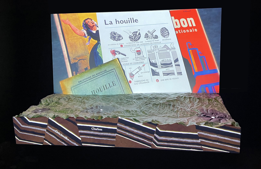 Des dispositifs interactifs – une chronologie actionnée via une manivelle et des dispositifs tactiles – complètent cette histoire géologique du territoire et l’origine de la formation du charbon. Un second espace présente l’histoire de l’exploitation du charbon sur le territoire et son impact paysager via un mapping sur une maquette. Le troisième espace propose une restitution graphique d’une galerie de mine. Pourvu de murs tactiles, cet espace permet d’aborder les conditions de travail, les luttes sociales, les risques, les catastrophes et le sauvetage des mineurs. Un «simulateur» propose de restituer les conditions – de chaleur, de bruit, de vibrations – des mineurs travaillant au