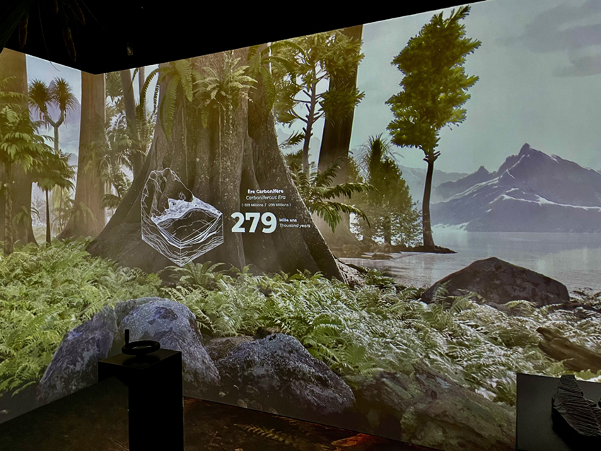 Le premier espace présente un spectacle audiovisuel immersif permettant une restitution de l’environnement au Carbonifère.